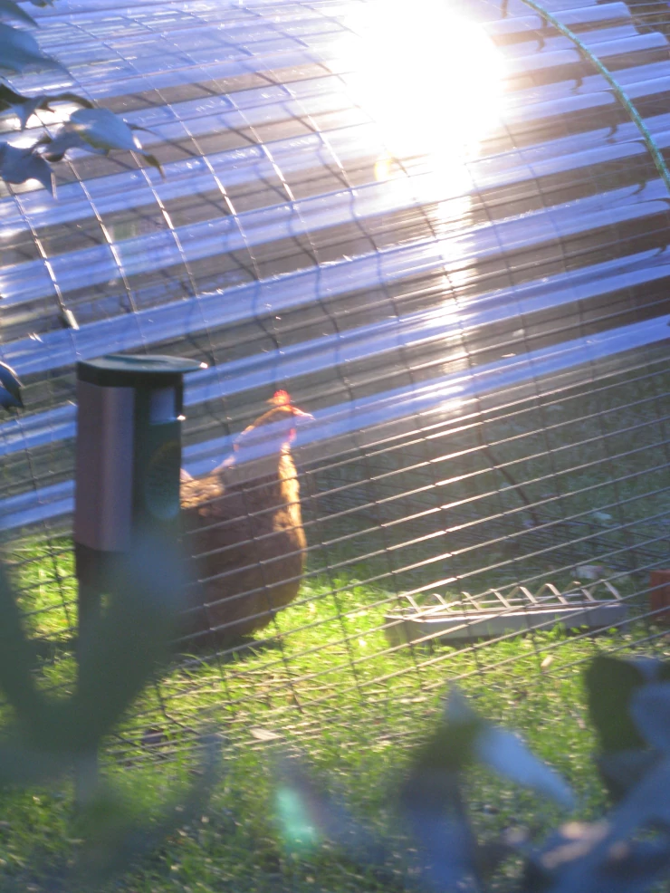 Caption: D and b have had a 150w lamp fitted to their run. it is on a timer set to come on at 4pm and Go off at 7pm. it's keeping them active after sunset.