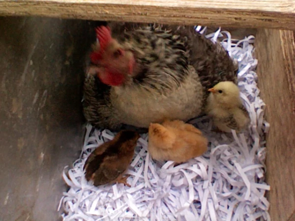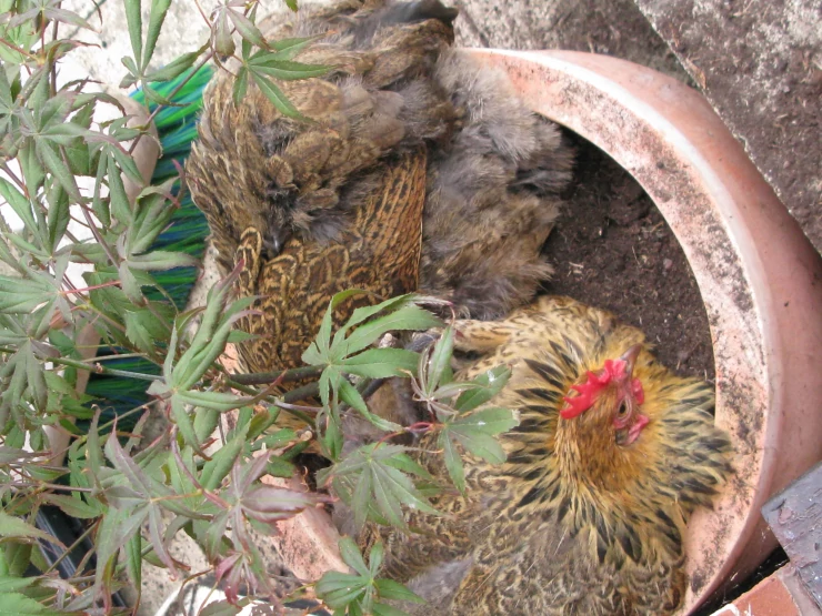Caption: Loopy settling for the night with her 5 adopted week old chicks