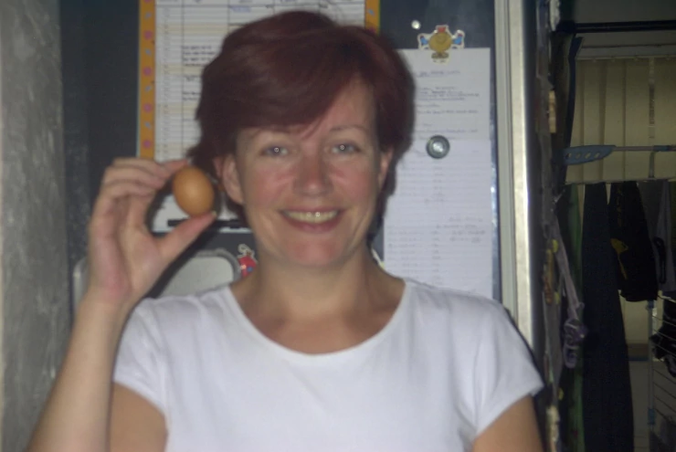 Caption: Bella, hoping for cuddles now that she has produced her first egg.
