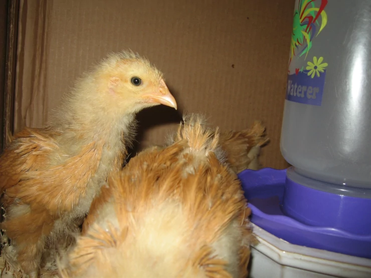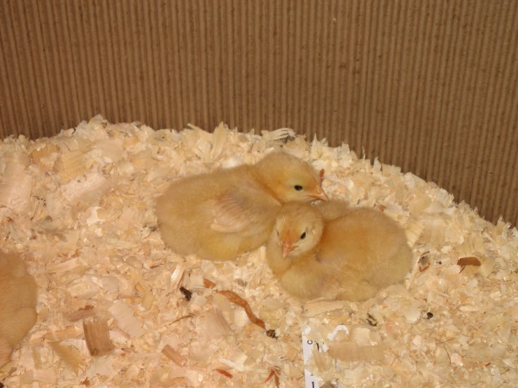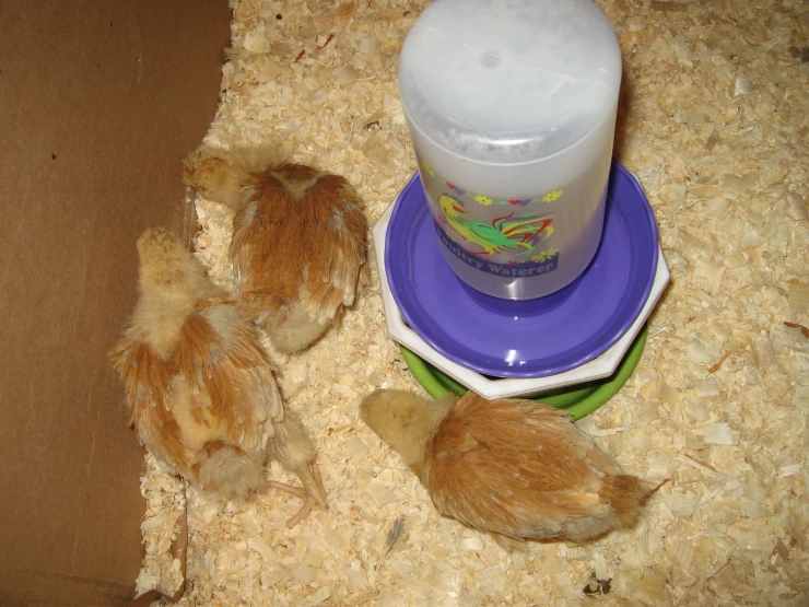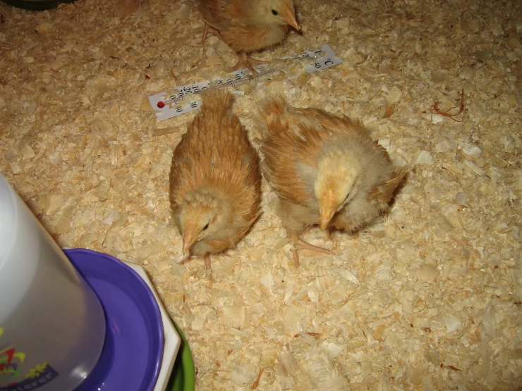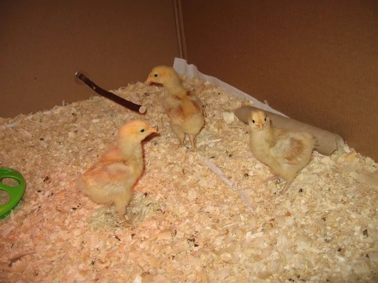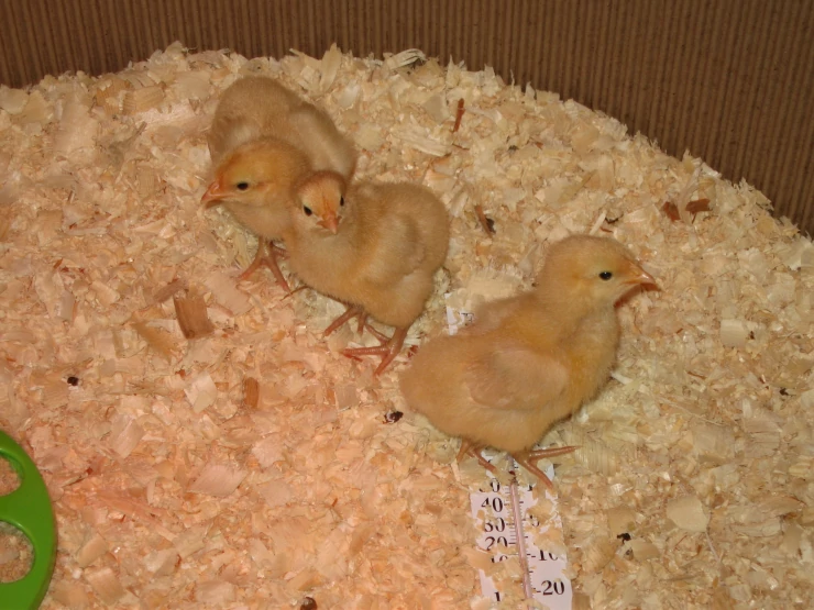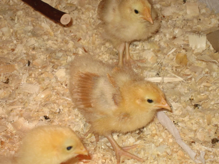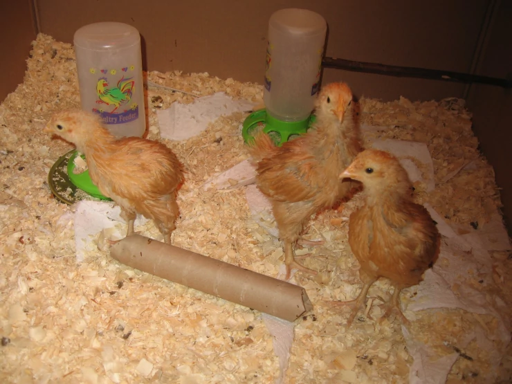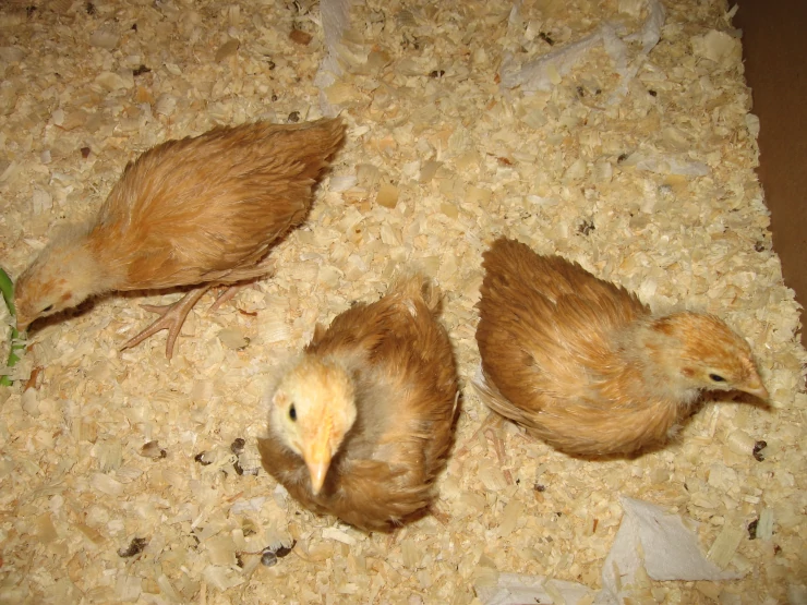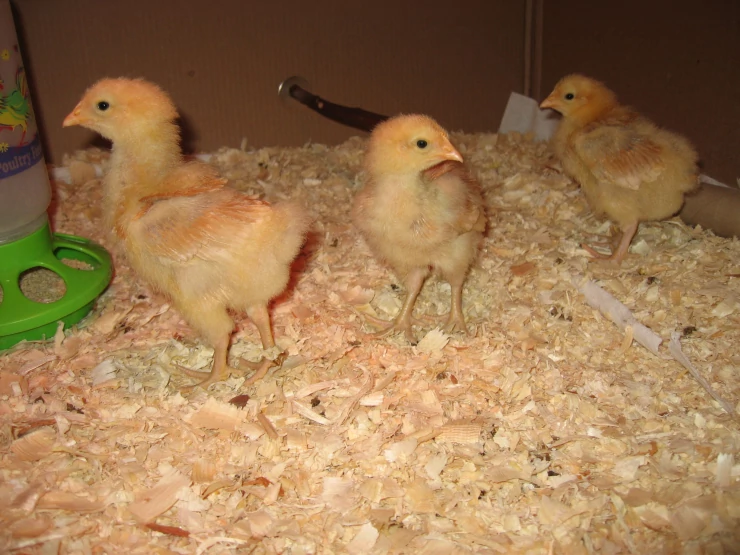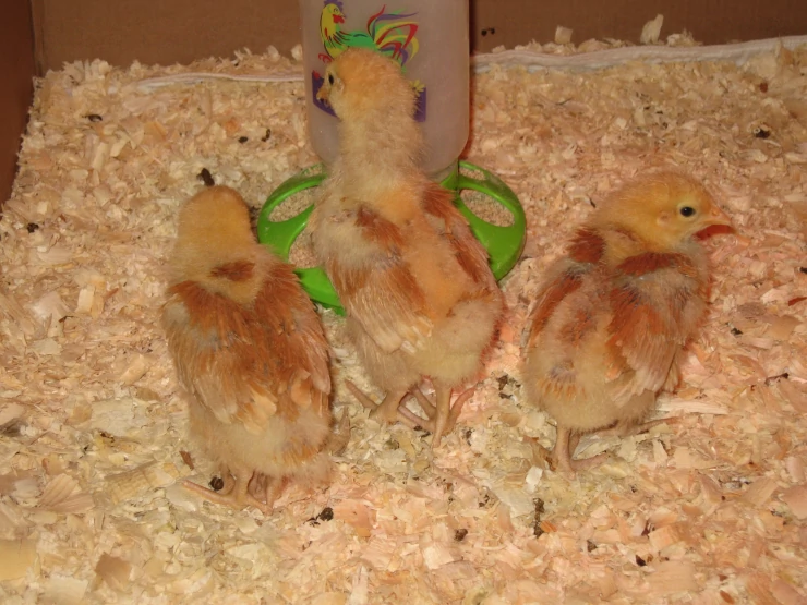 Caption: Good shot of all 3 chicks feather development 3 weeks old