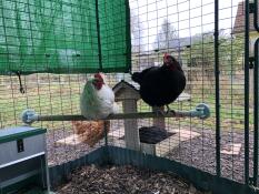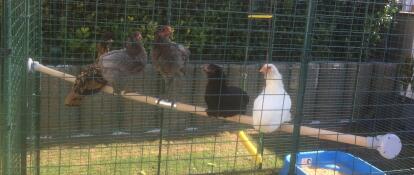 Chickens on Omlet universal chicken perch in Omlet walk in chicken run